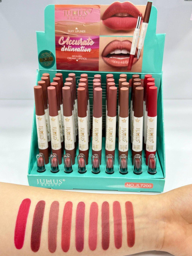 خط لب و رژ جامد دوطرفه ژولیوس بیوتی کد JL7200 در 9 طیف رنگی، با بافت نرم و مخملی مناسب برای انواع پوست لب با پیگمنت بالا و بدون پوسته شدن رولب با قابلیت یک سر خط لب و یک سر رژ جامد می باشد.